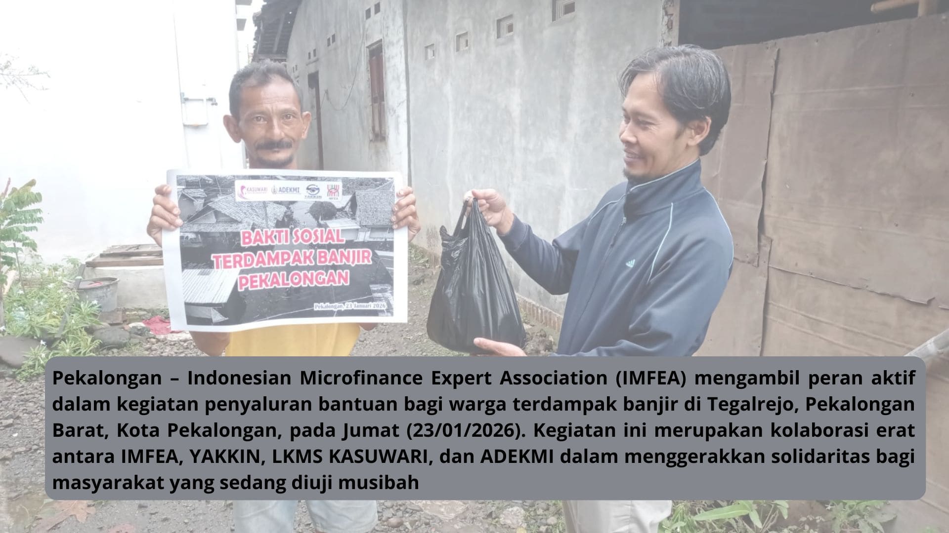 Pekalongan – Indonesian Microfinance Expert Association (IMFEA) mengambil peran aktif dalam kegiatan penyaluran bantuan bagi warga terdampak banjir di Tegalrejo, Pekalongan Barat, Kota Palongan, pada Jumat (23/01/2026). Kegiatan ini merupakan kolaborasi erat antara IMFEA, YAKKIN, Read more…